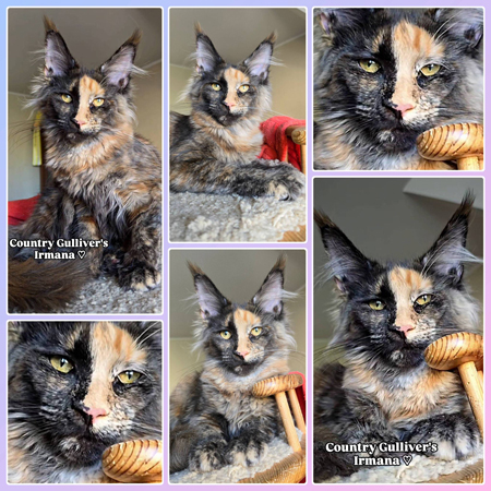 Мейн Кун / female maine coon Country Gulliver's Gimili Kiss - черепаховый дымчатый (fs) Тесты HCM, PKdef, SMA - N/N ![]() Кошка Джимили |